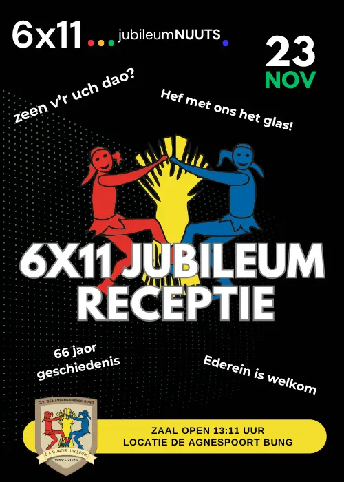 Op zondag 23 november 2025 vieren wij samen met CV De Havermennekes een bijzonder jubileum: 6x11 jaar Vastelaovend in Bunde!